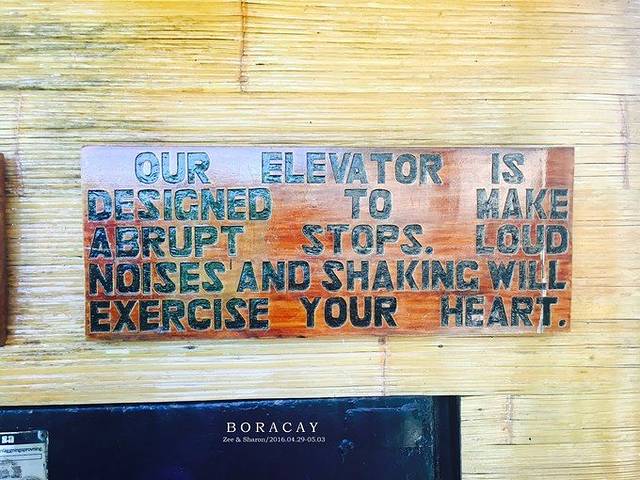 最后一餐到娜米酒店吃一顿,窗外就是湛蓝的天和层次分明的大海,海风微微地轻抚脸庞,感觉特别美妙!餐厅内部装修和环境也不错,在二楼,到酒店楼下,右手边是SPA,到平台那块按个门铃,就会有竹子搭的电梯下来接人,有个服务员会一起为你服务,电梯启动的时候声响还挺大,停止的时候稍微顿一下,感觉有点危险,但是也蛮好玩的,很有特色。下图为电梯里的一个告示牌,特别有意思。
