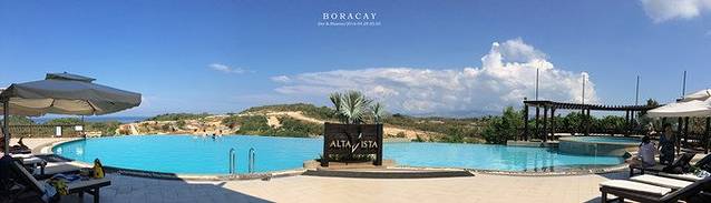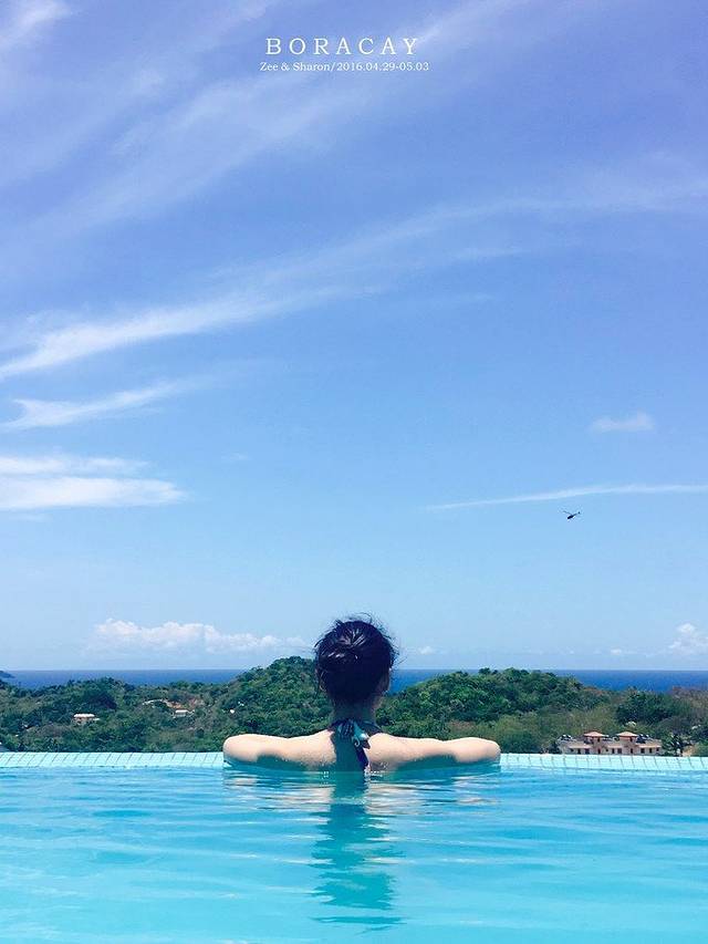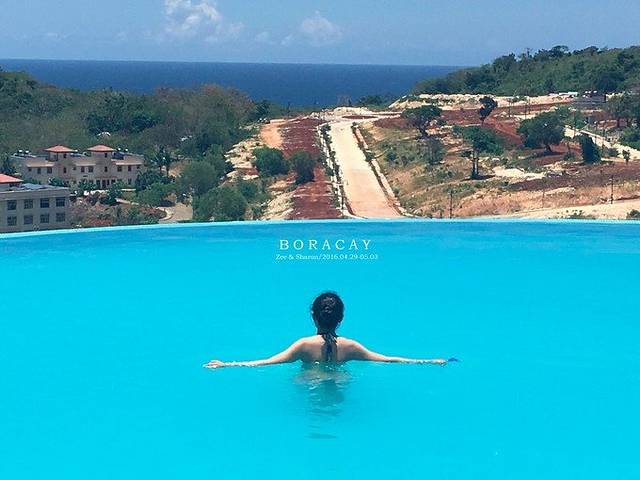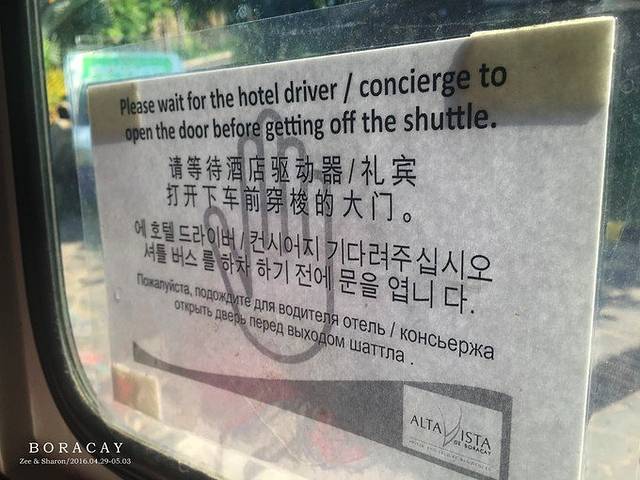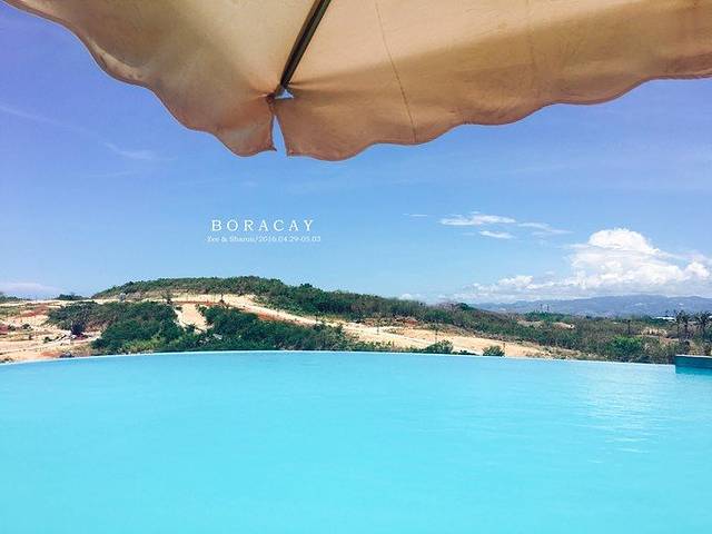 我们的酒店叫做长滩岛阿兰达度假村(Alta Vista De Boracay),据Peter说它是离闹市区S1最远的一家酒店了,位于Yapak海滩的一座小山上,最大的特色就是无边泳池。虽然它比较远,但是每天从8:40开始,每一个小时都会有班车去D'mall,每车可坐16人,所以最好提前十分钟就去排队,上不去就得等下一辆啦,高峰的时候,只要能凑够16个人,也是会送的。如果错过班车又赶时间,还是可以坐TUTU车去目的地的,一个小车,差不多可以坐下6-7人的,去s1或者D'mall需要150比索,我在酒店结识了另外两对小伙伴,我们都是结伴外出的,基本摊到每家也就50比索了。