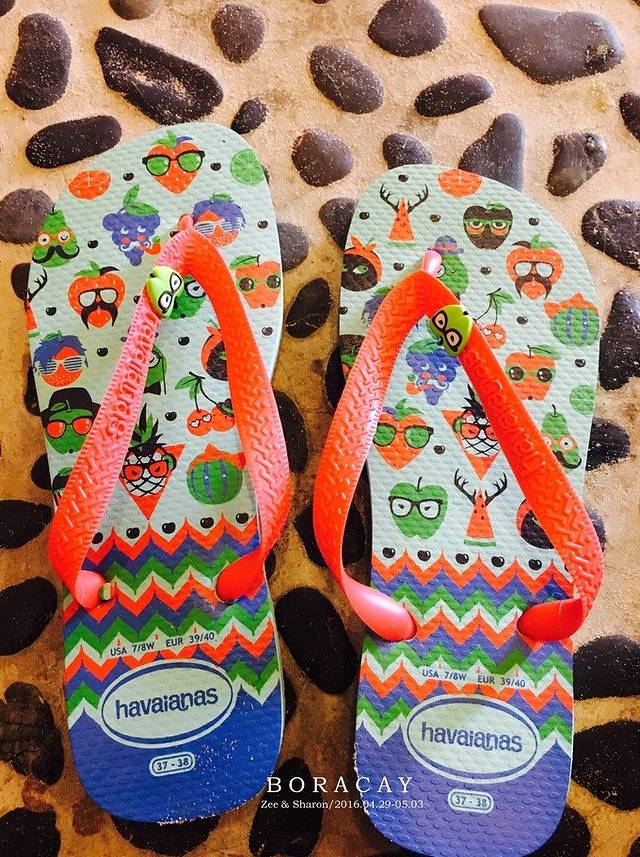⑧havaianas拖鞋:价格不一,看具体款式。这个拖鞋穿着很舒服,款式也很多,图案很漂亮。我本来没想买,但玩完降落伞我的鞋子就坏掉了,去买了新拖鞋,是不是很美丽?满2000比索还送一个漂浮的大鞋哦,充气的那种,可以直接拿着在海里飘着玩儿,超级棒!