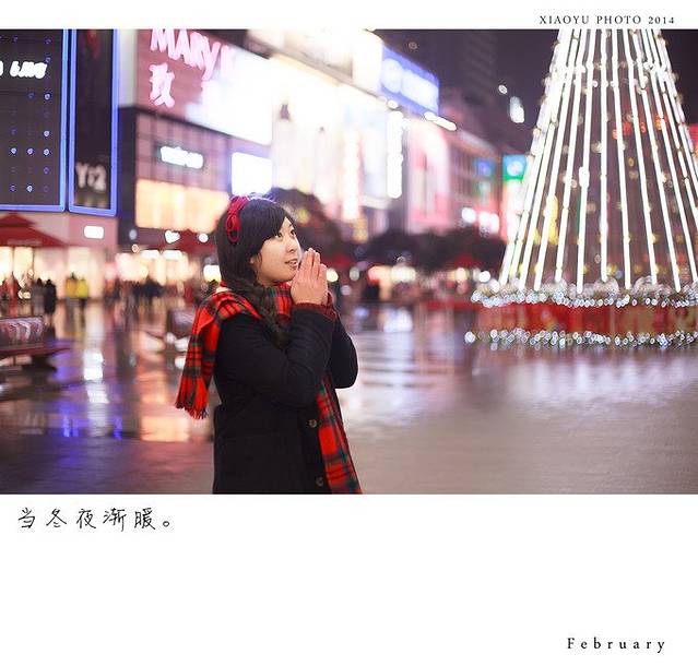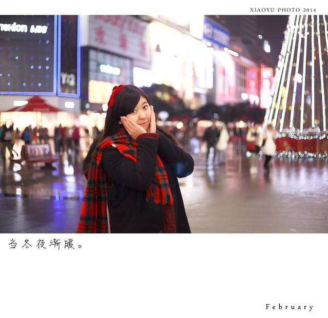 春熙路,也算是成都地标,这里晚上用大光圈镜头拍夜景人像是非常不错的,除了群光广场门口,还有王府井的天桥上。不过建议冬天,因为天黑得早,加上有围巾帽子当道具氛围会更好。