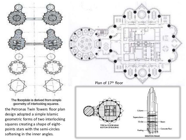 双子塔的平面设计参考了一种经典的伊斯兰几何样式——两个正方形互锁而成的八角星形,八个内角上还各有一个柔化边缘的半圆形。也许正是这种古典与现代感的巧妙结合,才让双子塔散发出如此令人着迷的魅力。