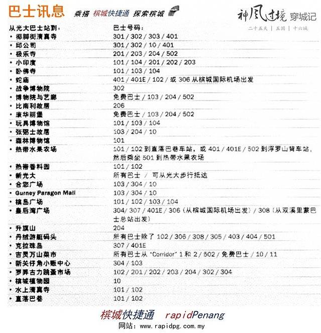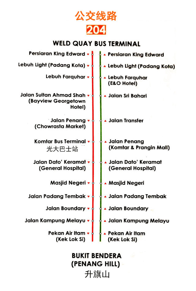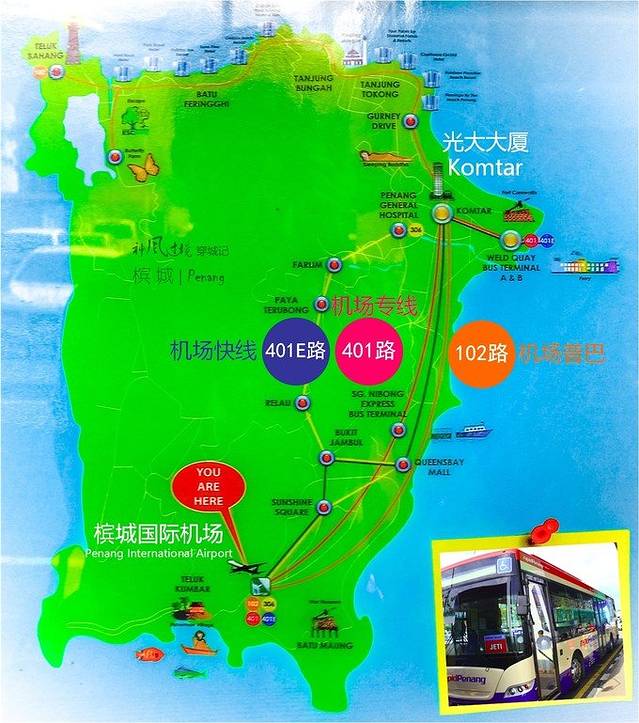 从槟城国际机场到光大大厦有3条公交线路:102路(橙线,机场普巴,沿途各站都停,市民也可以乘坐)、401E路(紫线,机场快线,停几个大站,只接送机场客人)、401路(红线,机场专线,只经停SG. NIBONG EXPRESS BUS TERMINAL一个站,只接送机场客人)。我当时坐的是102路,从机场出来这路正好发车,车程50分钟左右到光大大厦。