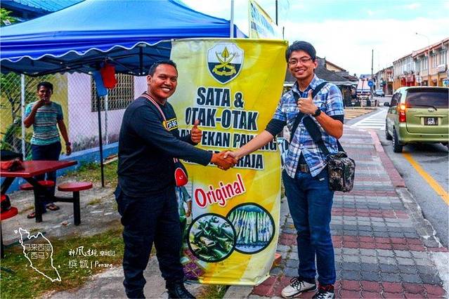 这家店的老板是槟城的一名公务员警察,马来人,家乡就在西马东海岸的登嘉楼,Sata 和Otak-Otak是他的家乡美食。他利用下班时间和他的亲弟弟在街边摆起了美食摊,刚试业不久,打算过阵子把摊点搬到游客更多的夜市去。他能说一口流利的英语,而他弟弟没有接受过好的教育,一点英语都不会,他弟弟在帮我烤Sata 和Otak-Otak,他就在一旁跟我聊天。重要的是,他们家的Sata 和Otak-Otak味道很不错!