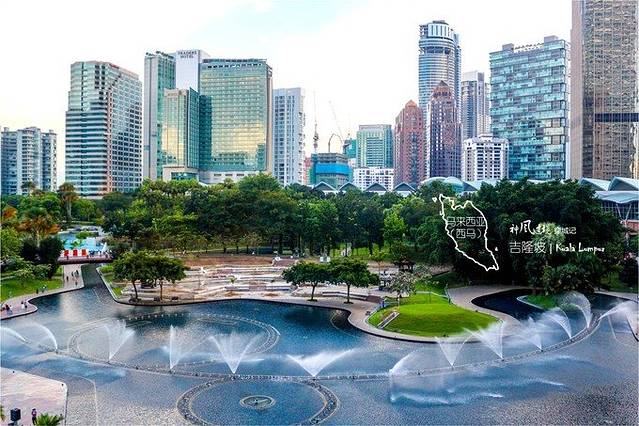 双子塔的内侧是一个占地50英亩的城中城公园(KLCC Park),由巴西著名的园林景观建筑师罗伯特·布雷·马科斯(Roberto Burle Marx)设计,为吉隆坡市中心提供了美丽的绿化带。公园是24小时对大众免费开放的,最初的规划设计师能考虑到为市中心建立这样一个公园,真是太有远见了。中央公园中心有一个10000平方米的交响乐人工湖(Lake Symphony),每天中午和晚上均有音乐喷泉表演。