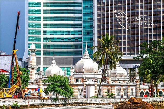 接下来,观光巴士会路过吉隆坡中环车站周边云集的商务写字楼和五星级酒店。紧邻中环车站北侧的是2003年建成的吉隆坡希尔顿酒店(Hilton KL)和吉隆坡艾美酒店(Le Méridien KL)。斜后方是马来西亚第二大银行联昌国际银行(CIMB Bank)的总部大楼。现代化的高楼大厦与传统的伊斯兰建筑形成鲜明对比,也让人感受到一种历史与现代的交融并存。