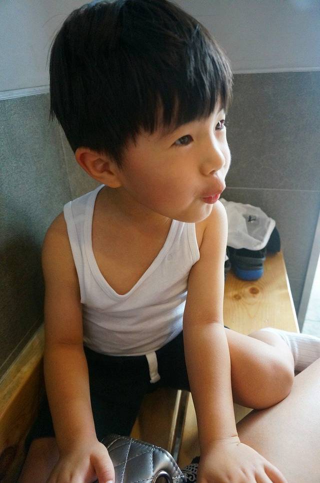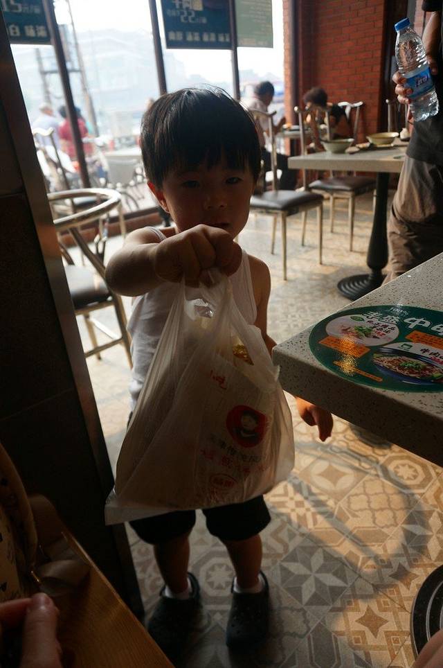 餐厅里没空调,小朋友彻底热的够戗,其实这里就是传统的早点铺,有油条、豆腐脑什么,进门先换卡,换卡后再买早点,走时退卡,交20其中有10块押金不能使用
