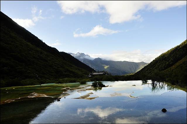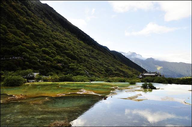 无心插柳柳成荫,起个大早,集合完毕五点半准时发车,本希望下午一点之前到达黄龙景区,可谁知上路没多久大巴的轮胎出了问题,换胎,加上导游在茂县更换到期的导游证,及某商家上车推销红景天、高氧水等等,实际到达景区时已是四点过了,也只好放弃上下步行的计划,改成上行索道,下山小跑步了。别个下山的时候我们上山,错时,游客少了很多,可以大步走路,可以换角度拍照,还有,最最庆幸的是遇上了晴好天气,看到了黄龙的艳阳天,看到了落日中梦幻多变的黄龙主峰,在雪山梁子看到了中秋夜的圆月,出彩!