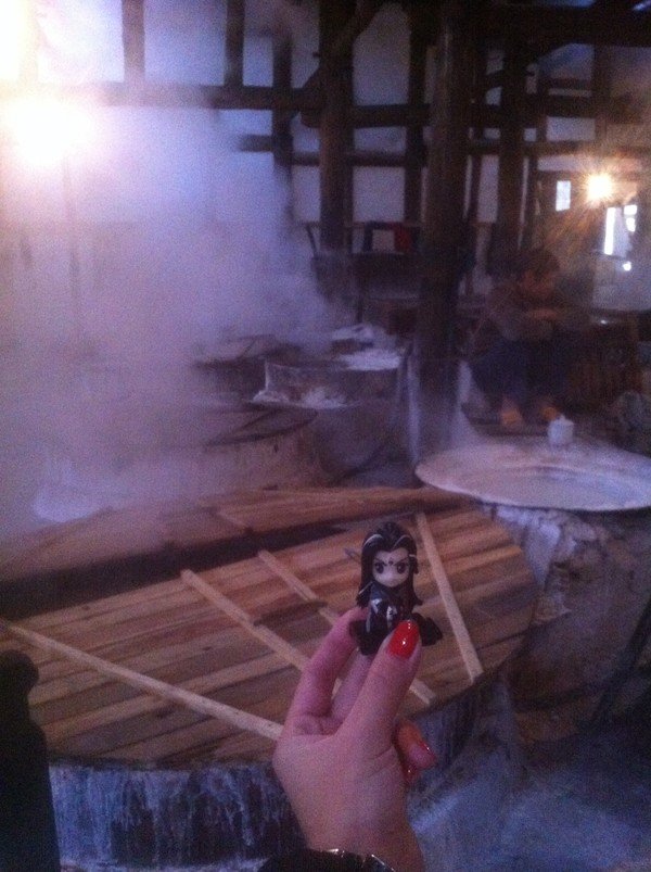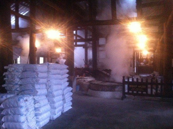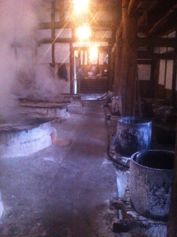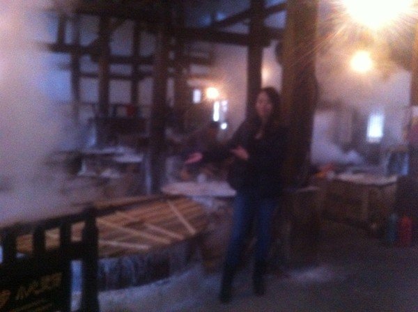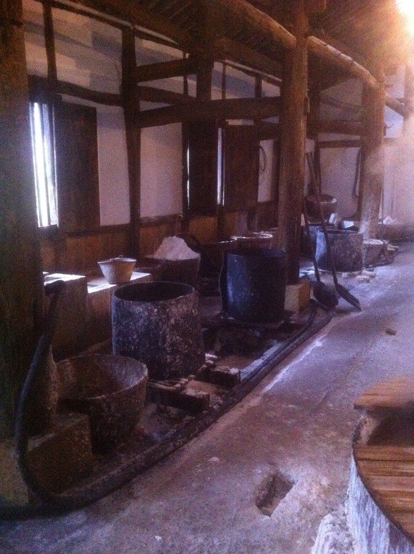 燊海井最近因为舌尖上的中国着实火了一把,不过我们去的时候,一个游客都没有。没人的地方我最喜欢了,进门就看到高高的天车,下面是小小的盐井,离进了能闻到呛鼻的味道,和硫磺有些相似。另一边是产生动力用的大车。推了下试试,真沉重。上到小楼里,一片朦朦胧胧的热气,正在煮盐呢,这一口一口大锅冒着热气,原始的手工制法真令人感动。手工作坊和原始方法总是有迷人的无穷魅力,看来看去不舍得离开。屋里还有两个翘着脚闲聊的工人。