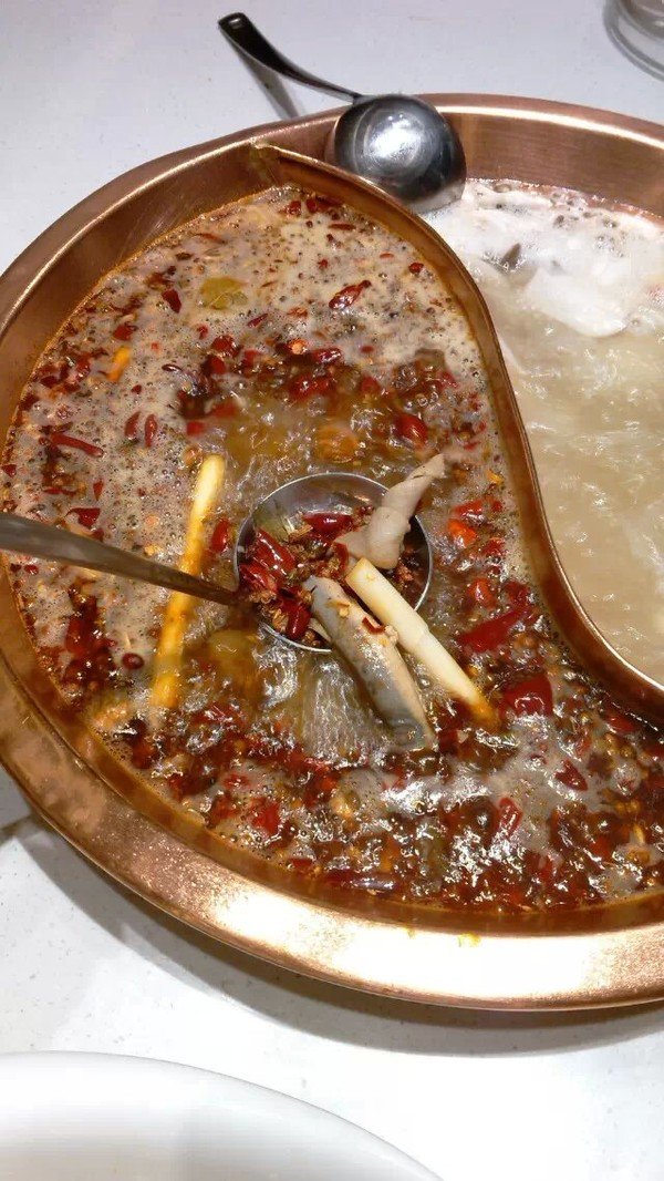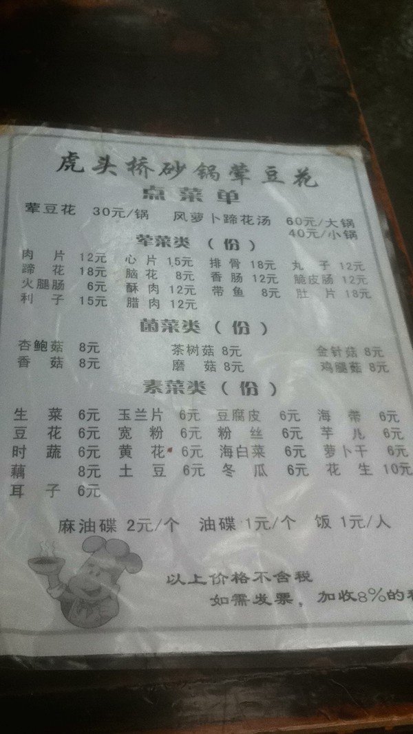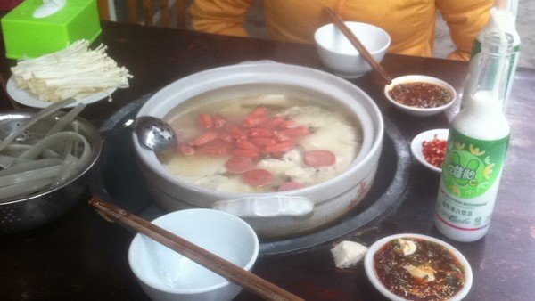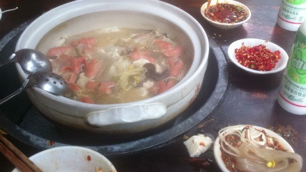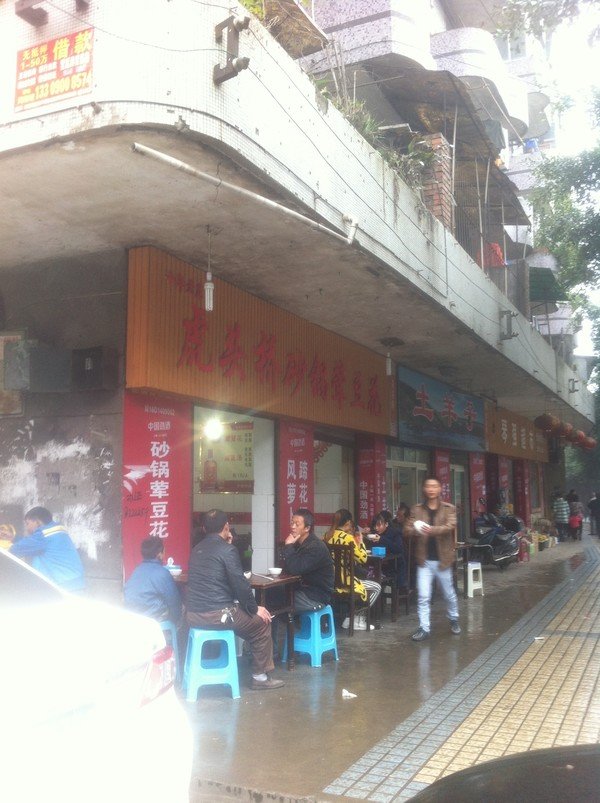 然后我们到沙湾站坐11路去贡井,这是城中奇景平桥瀑布的所在地。不过久久要先带我去吃好吃的。吃什么?豆花。豆花不是街边几块钱一小碗的小吃的……不是的!原来豆花也能煮锅子啊,眼大肚子小我又点多了,也是被这便宜的价格迷惑了,没想到量这么大。细雨轻寒,坐在街边骑楼下,吃着暖暖的豆花锅子;快哉!我俩吃呀吃呀,努力吃呀,这个锅怎么都不见少,直到再也吃不下,还是有一大锅……