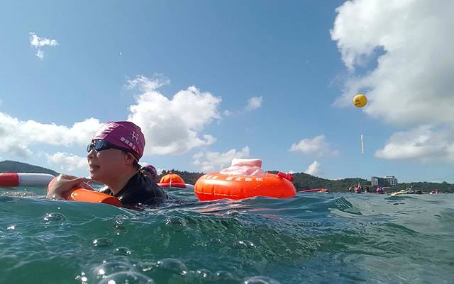 两万名泳客陆续下水后,形成一道三千公尺长,人头浮动的水道。