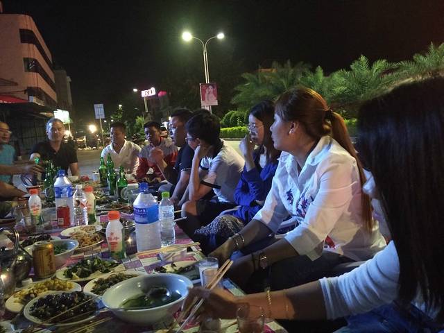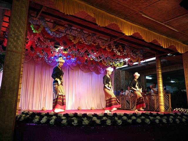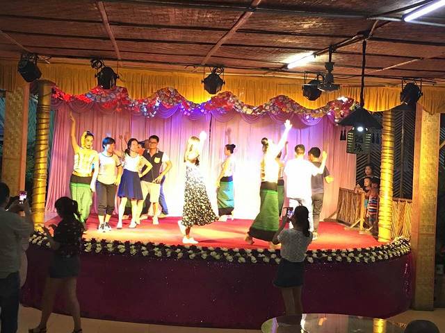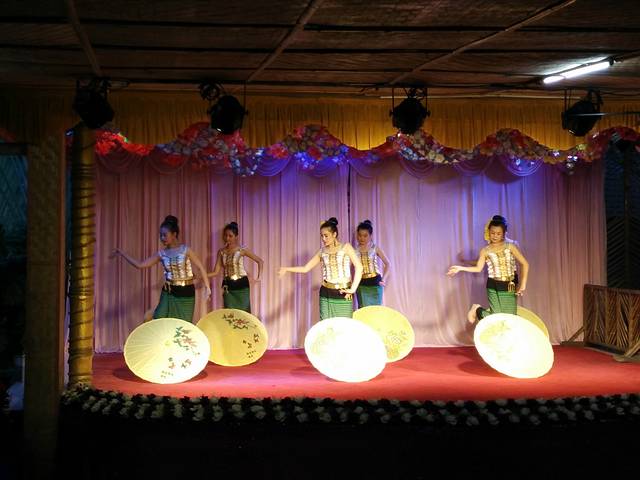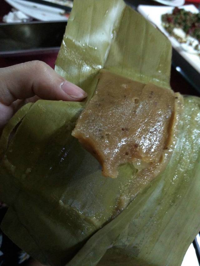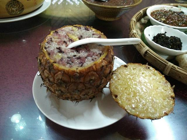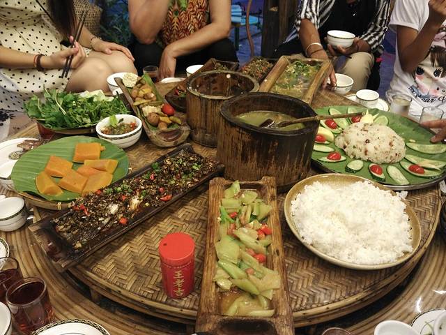 餐厅的菜是地道的傣味,环境不错,餐厅中间有一个舞台,6点半开始傣族歌舞表演,可以一边用餐一边观赏。表演结束后她们会来唱祝酒歌,然后邀请大家举起手中的酒杯,高喊“水~水~水水水水!”水代表福气,喊的越大声,你的福气就越多。我的哈尼同事家喝酒平常只有喊两声“水”。每个地区还是稍微有点差别的。