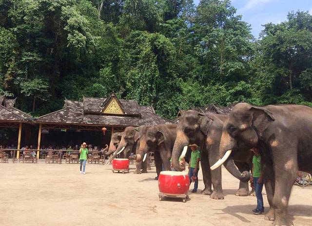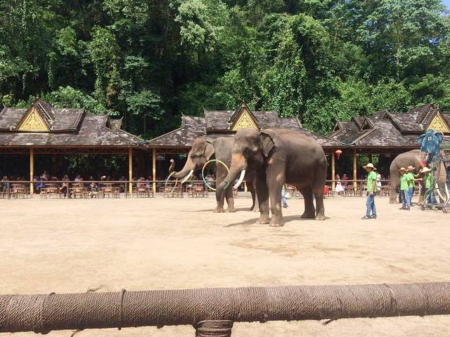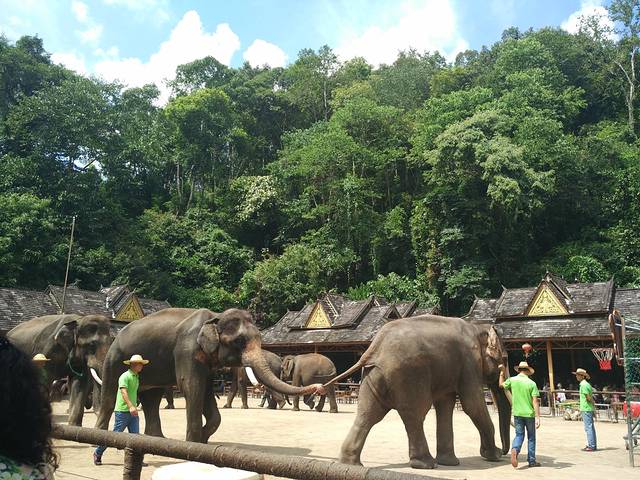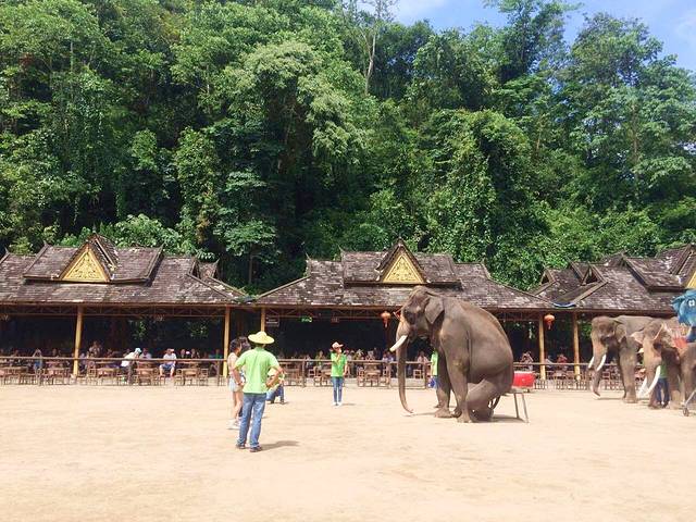 进入景区先去大象学校观看大象表演,有利的观看位置是在大象出场的门旁边。表演开始前大象会先出来跟游客拍照合影。
