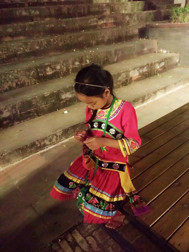 坐在摊位旁边穿着民族服饰的小女孩,特别美吧~