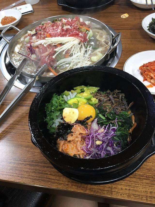 我们点了两个石锅拌饭,10000韩元一份,和一份蔬菜包牛肉。