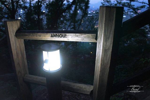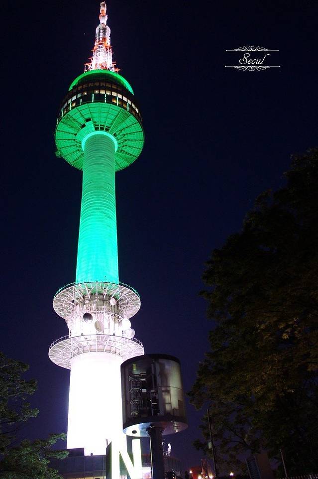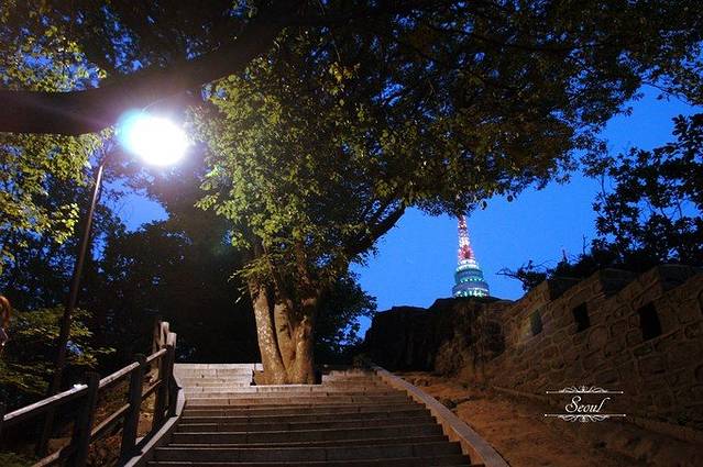终于爬到顶啦。近距离看见了首尔塔,这个时候已经亮起了绿色的灯光。