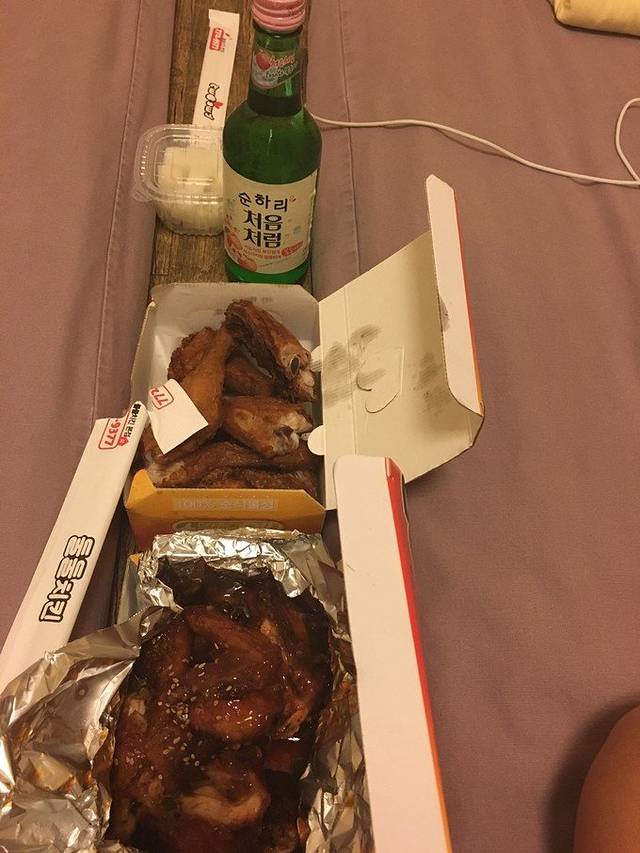 往回走又路过白天经过的便利店,又进去买了瓶烧酒。虽说炸鸡应该配啤酒,可我们就买了瓶烧酒,不为啥,任性!