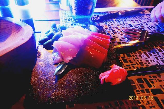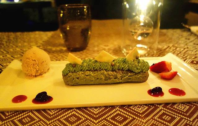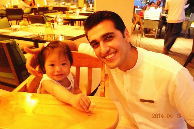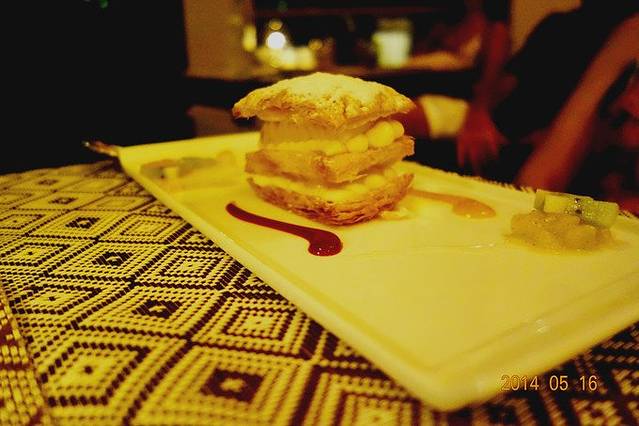 本来是在露天,在海边吹着海风,在火把的火光下用餐。结果,刚吃完前菜,就下雨了。。于是换到亚洲餐厅带屋顶的地方吃饭(也就是早上用早餐的地方)也是这晚,Aimee认识了这帅气的员工~(前菜我点了刺身没拍下来,给大家看看海鲜拼盘吧,我觉得右边那半只应该是龙虾不会错了。味道,我想说,真的很难吃,哈哈。甜点我没拿到中文餐单,就看着单词估计这点,没想到这水果千层饼超级好吃呢!)吃着吃着,几分钟雨就停了,然后月亮偷偷露出了脸~