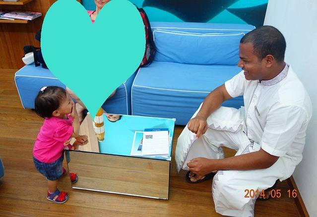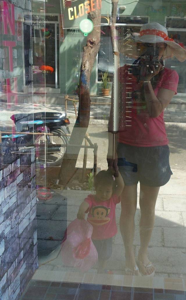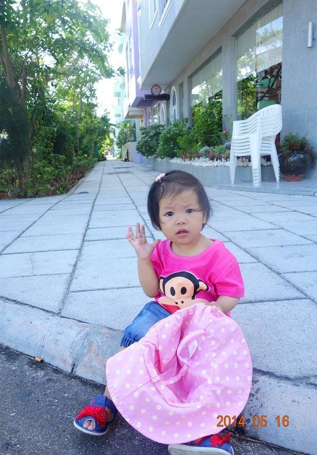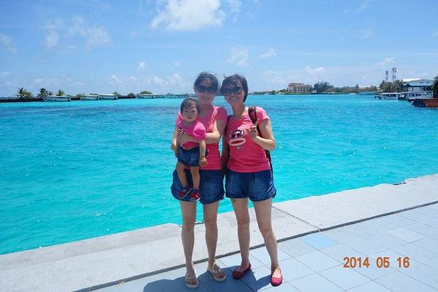 因为川航的直飞是15号下午4点半,到马累是当地时间晚上8点半。所以当时也找代理定了一晚马累的住宿,虽然心里有准备马累的住宿会非常差,结果,果然比想象的还差,不过房间还算干净,早餐,我可以吐槽一下这家的早餐么,当真只有白稀饭和鸡蛋一个,菜都没一口啊!而且7点过就叫起床吃早餐了,但是给我们安排的要11点半才出发登岛,因为是快艇登岛,不着急。丫头不想呆房间,老妈怕热又不愿意出去。。于是这个重任就落到我身上了。。于是带丫头出去凹造型。。然后,丫头跟小黑真是笑到脸都抽筋了吧- -。。。