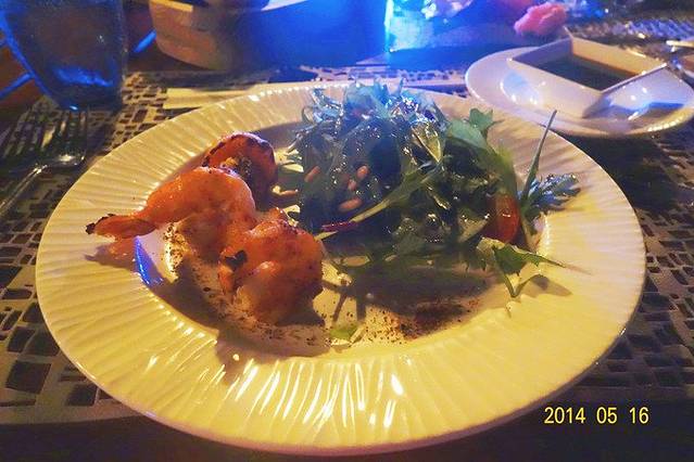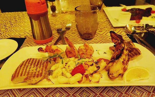 【晚餐】这里的晚餐有意大利餐厅、亚洲餐厅、印度餐厅、烧烤餐厅可以选,第一晚我们选择了海鲜BBQ,在主游泳池左手边,晚餐都是点餐的形式,每人一个前菜+一个主菜+一个甜点。之前会上一份面包和烤的饼干,沾着每个餐厅不同的配料吃,亚洲餐厅这边就是干干的番茄酱,意大利餐厅就是橄榄油+醋。面包其实是管饱的。。你吃完可以再要。但是我觉得前菜和主菜也完全够吃了。你可以叫他们提供中文餐单,餐厅有 一位会中文的,意大利餐厅会中文的是一位马来西亚的女人。