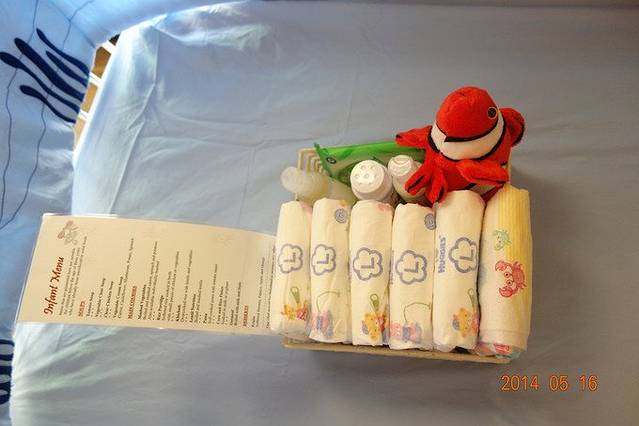 配的婴儿床、送的玩具尼莫、洗澡的、纸尿裤(之前看游记有提到免费纸尿裤提供,但是不确定现在有没有,于是自己也带了很多拉拉裤去,又不想背回来,所以基本没怎么用他们的。不过纸尿裤是不限量提供的。。用完他们会补充,而且在主游泳池的更衣室里,有专门换纸尿裤的地方,提供各种型号的纸尿裤,牌子是好奇。)然后送了婴儿吃的混合水果泥、还有旺旺雪饼英文版- -!!!!红酒、水果。ihome播放器,iphone4可以直接充电。