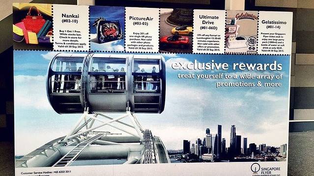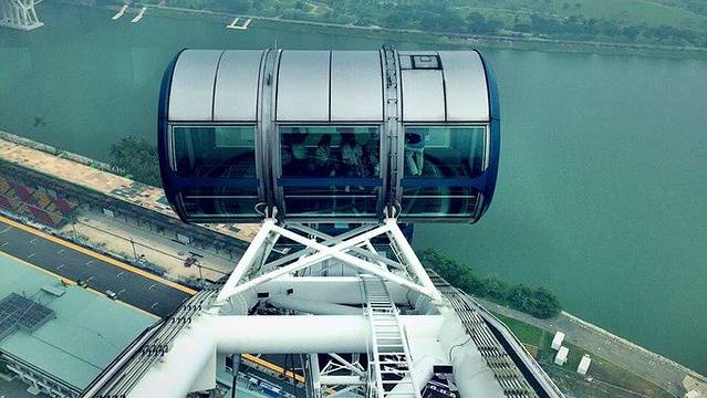 新加坡摩天观景轮是目前为止世界最大的巨型观景轮,每个舱位可以容纳20名乘客,成人票价33新币, 游客可以在距离地面165米的高空,俯瞰整个滨海湾地区的全景,远眺新加坡繁华都市。