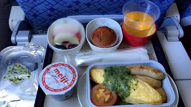 套餐有两种选择,空姐问我要鸡肉粥还是烤肠鸡蛋... 我选了后者。
