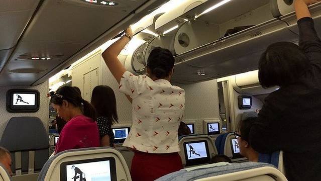 我旁边坐的是来自一位美国加州的姐姐, 我看她提了两个行李箱,主动帮她放到行李架上。 她告诉我她叫Abbey,第一次去中国香港,整个人很激动。我告诉她香港和新加坡无论经济还是气候都很像, 她还一脸兴奋的问我really?