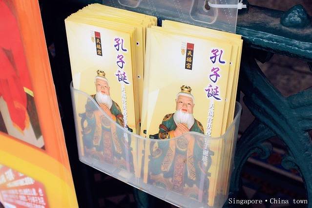我不知道这是什么牛车水的什么庙,倒是门口摆放的孔子诞辰手册吸引了我的目光。