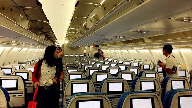执飞新加坡的国泰航空CX659是空客A333,双通道走廊,一排8个座位。虽然是宽体机,但是由于机舱空间有限,所以经济舱的布局依然十分狭窄。早前3个月我就在国泰官网上选好了61A靠窗的座位,上飞机后,我发现座位上已经坐了一对儿上了年纪的夫妻。我简单问好,礼貌的告诉他靠窗是我的座位。结果这位爷爷颤颤巍巍站起来用英语告诉我想和我换下前排靠走廊的位置, 当时正是登机的高峰期,走廊里已经堵了很多人,反正也是夜间航班,坐在靠窗也看不到窗外景色,所以我还是点头同意了。