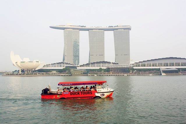 那只红色的船便是新加坡著名的鸭子船,称之为“鸭子船”是源于它水陆两栖的特性及整体可爱的大鸭子造型,鸭子是更具趣味及幽默性,是水陆两栖旅游意欲传播的理念。