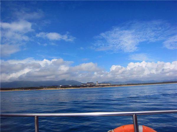 其实在岸边就能看到,但坐船需要10分钟到达蜈支洲。