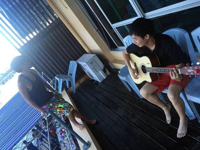 这次的住宿定在潜店,四人间海景房,侧卧躺在床上,眼前就是无敌海景和龙门客栈。位置也好,每天出宿舍下楼就可以上船出海了,不用拎着装备去码头。阳台下面是海鲜楼一条街,可以随时观察餐馆的订位状况。出门走两步是万宁,买日用品都很方便。