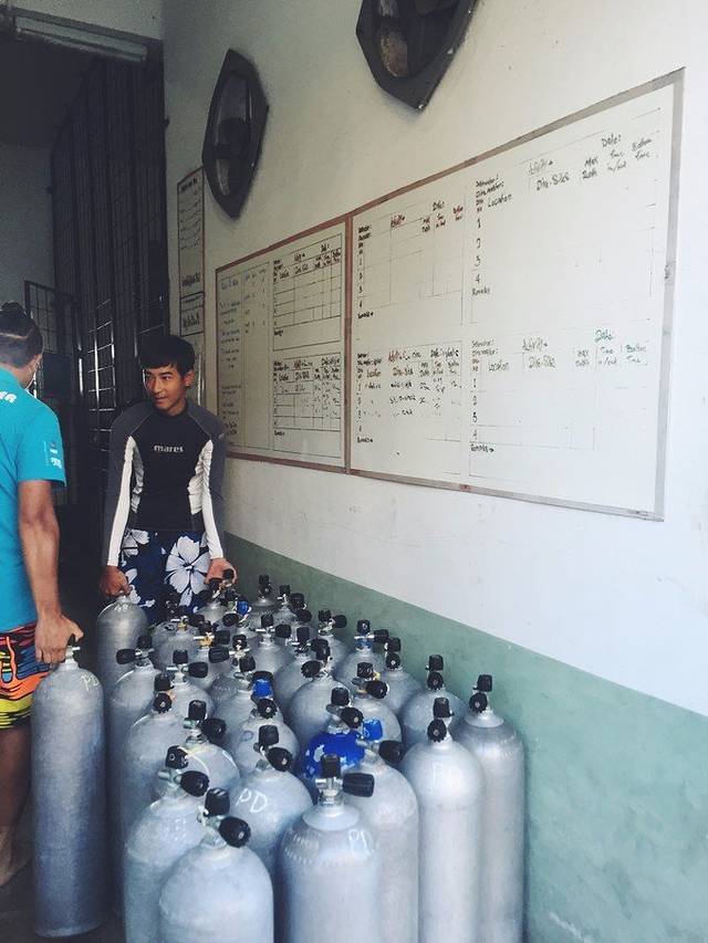潜店的早晨繁忙而有序,虎哥忙着安排各种浮潜,深潜,考试的事情。教练和小黑在装气瓶。学员在拿前一天打包好的装备装船。每天如此,但是并不乏味。8点半,船准时出海。