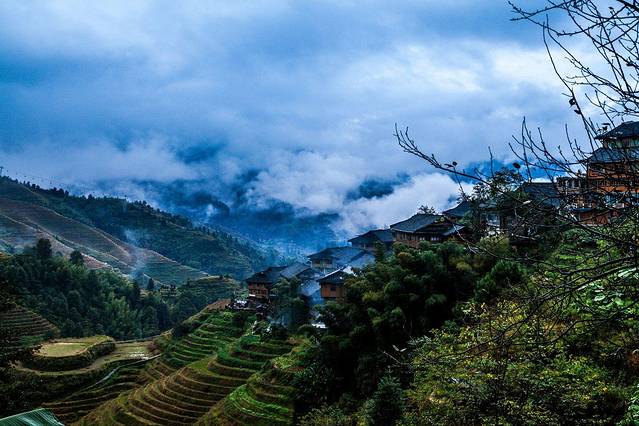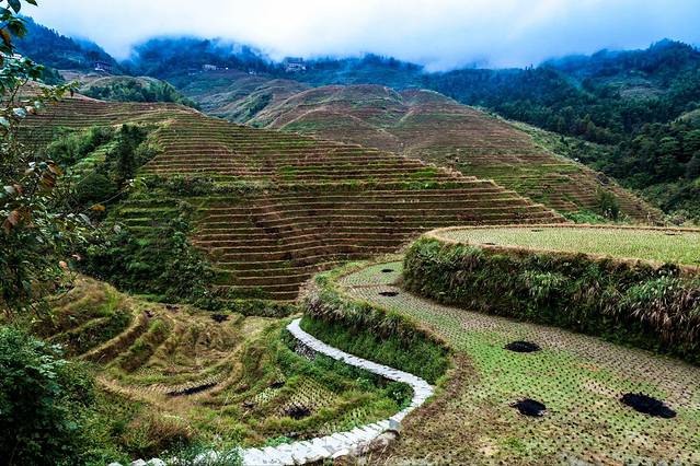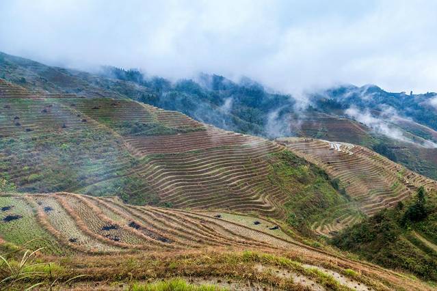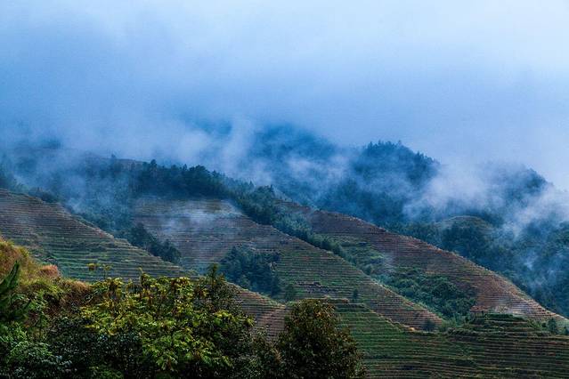 细雨蒙蒙的清晨观赏雨雾中的龙胜梯田那是最赋有诗情画意的事了,仿佛一下就走进了中国古代的水墨山水国画中,又仿佛置身于一个神秘的童话世界,那雨雾中隐约的梯田呈现出梦幻般的轮廓