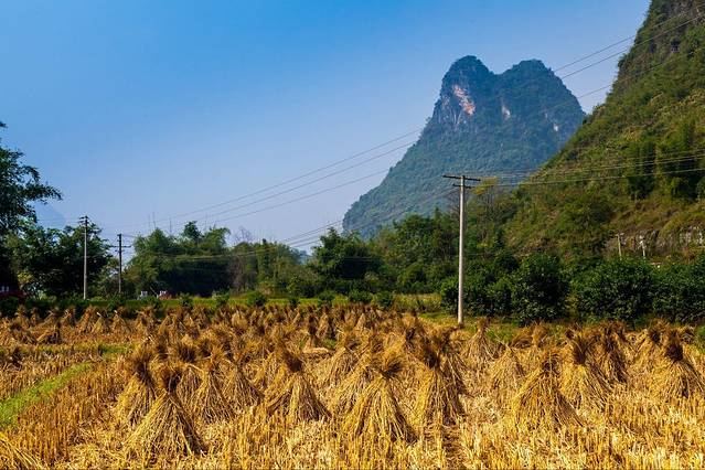 那山、那田、那水、那树,像沙盘上的作品,在两岸依次排列。收割完的稻秸有序的捆扎,矗立在田里,犹如金甲的武士守卫着大地。