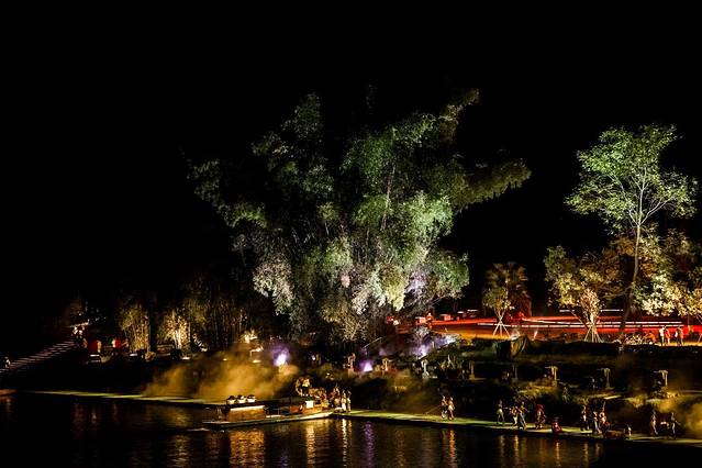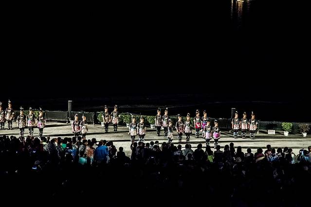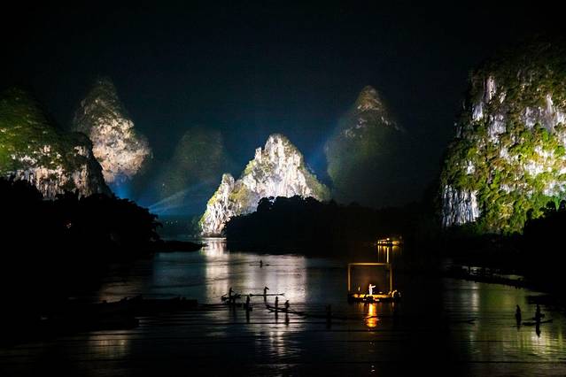 借助阳朔的山水实景又把刘三姐故事演绎了一遍,看的时候观众真是叹为观止,真的被演员们的各种技艺惊呆了,有一段是集体划船,演员们划船的效果就好像在平地上走一样,还有那些火把,从远处划船而来,画面精美,决对值回票价。