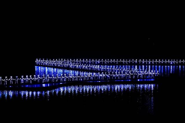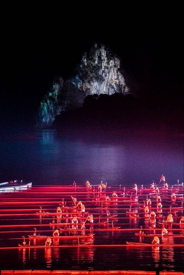 最为震撼的就是一群渔夫手拿着红色帷布 有节奏的舞动着 帷布抖动的声音和背景音乐的鼓点声互相融合 震撼人心。