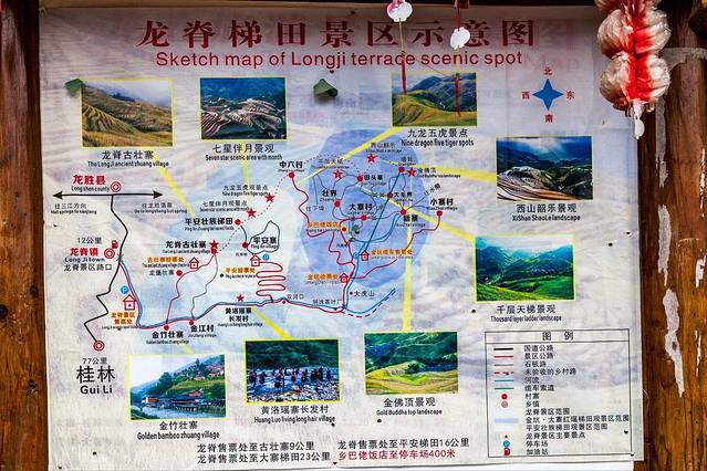一早就去龙脊梯田,结果在车上等了一波又一波的客人,终于在中午到了景区门口。盘山路上车速过快,为避会车还险些撞上路边的岩石。