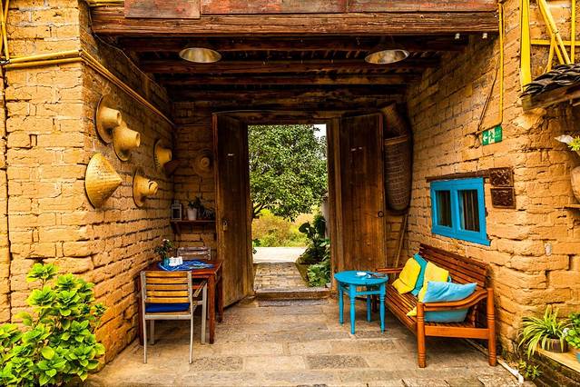 院子里零散地种着几颗柚子树,几张竹藤做的椅子和木质的桌子与周围的环境显得格外的搭配,而高粱穗做的扫把,农田里晒干的稻子,晒得金黄发光的玉米,盛水用的葫芦,这些早已被城市的人们所遗忘的农田劳作工具都一一挂在土制的泥墙上,乡土味儿十足