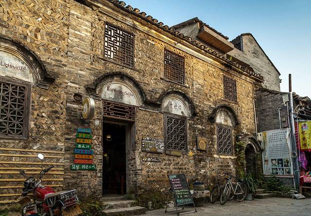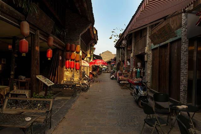 这条不足1km 的街道,由石板砌成,呈弯曲的S 形。两旁房屋古朴典雅,桂北明清时期风格,小青瓦、坡屋面、白粉墙、吊阳台。街上摆满了各种旅游纪念品,两旁的饭店、餐馆、网吧、酒吧等等都是中西合璧的,几乎所有的招牌都是中英文对照