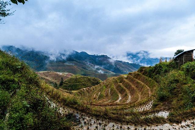 爬到山顶后雨停了,在山边的小亭子里,空气清新无比,看着眼前的梯田,犹如一道丰富的早餐,让我有一种满足感,站在这里,不用拍照,已经是极大的视觉享受。