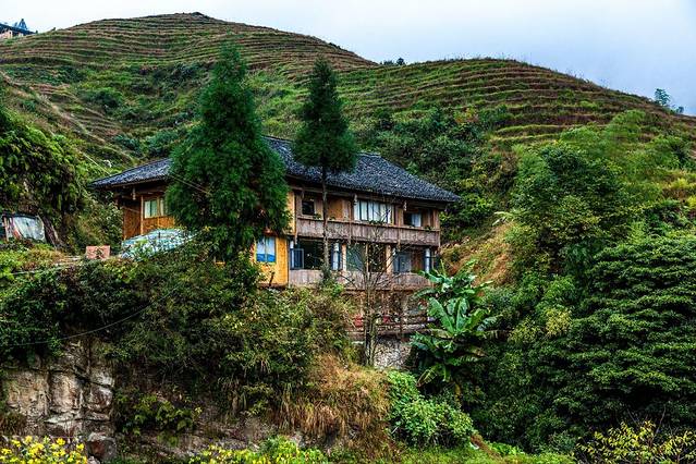 龙脊梯田景区居住的都是少数民族,主要居住着壮族、瑶族两种民族,我们所住的地方是瑶寨,当然是瑶族为主。大部分的房屋都是典型的木质结构,由于是依山而建,绝大部分的房屋都是吊脚木楼。