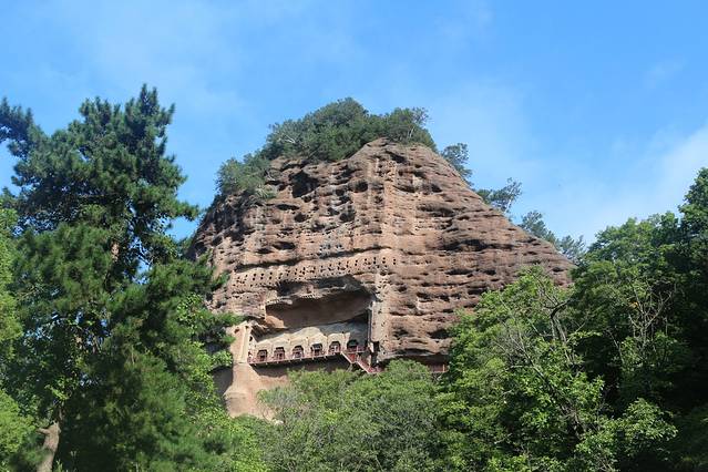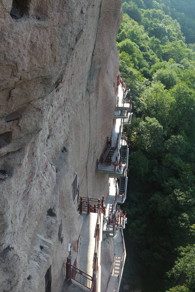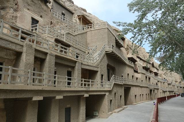 从右向左可以看到“九层塔”,里面坐落着世界最大室内盘腿而坐的泥胎弥勒菩萨的造像,以及王道士发现藏经阁,“反弹琵琶”飞天伎乐菩萨。。。