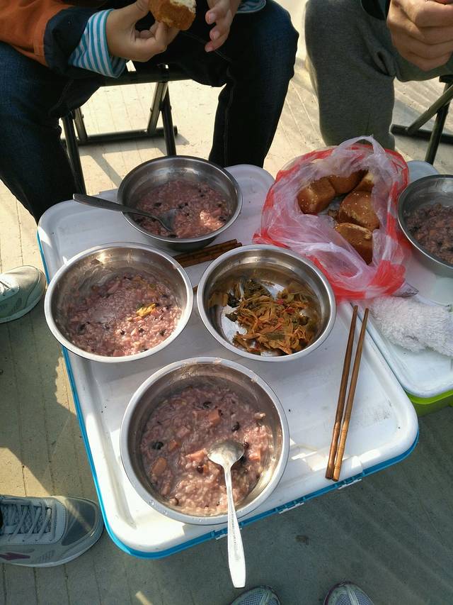 在服务区吃的早餐:八宝火腿粥+小咸菜+蛋糕。像样吧~~