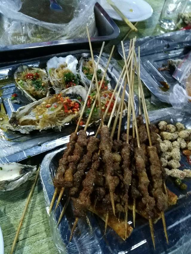 车停在院子里,我们一家四口往广场走,沿街有很多海鲜烧烤。