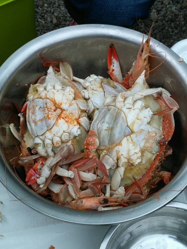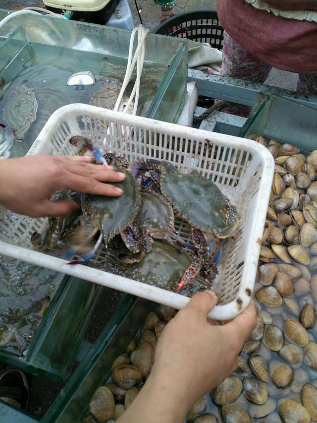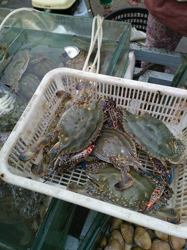 想了好久的蟹子呀!!😄往东港市前行,途中买了好多海鲜,有蟹子、大虾、蚬子。一大堆海鲜,才花了150。😊