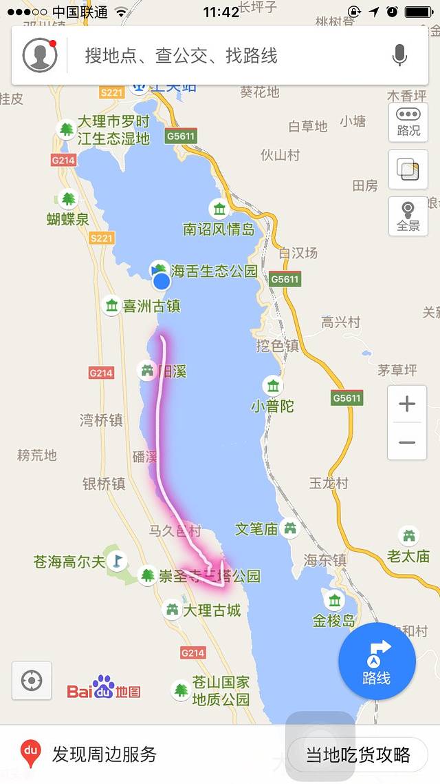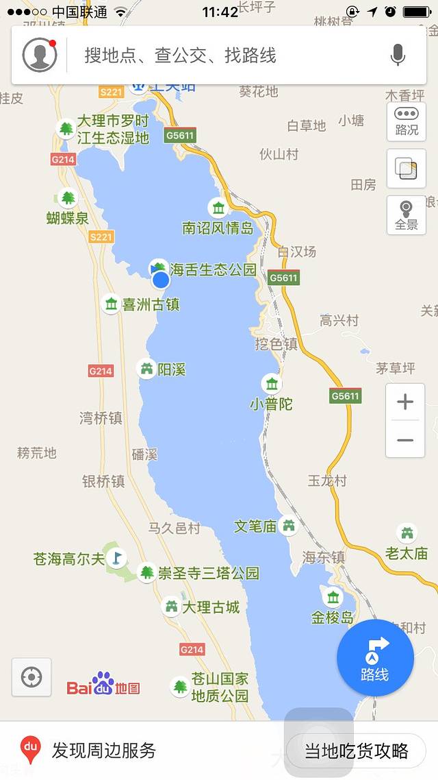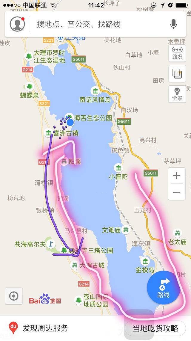 我们的路线定的是成都-双廊-喜洲-到喜洲金圭寺-大理古镇-成都,来了才发现,这样的顺序让我们开更多的车程,因为相当于是倒着玩的,后面给你们发图标注,所以如果想方便的小伙伴可以把我们的顺序倒过来,就很顺路啦!下面那个就是整个洱海,我们就是环游的,但是我们的顺序让我们走了很多冤枉路,你们可以看你们自己怎么玩方便!