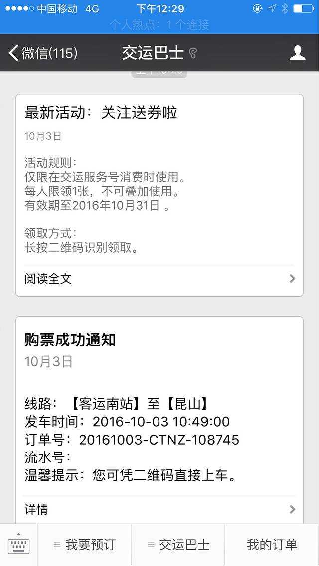 司机说上海只有上海南客运站,记住了。这个客运站已经赶上小型火车站了,因为路线不是很明确,问了站台服务人员,态度还是不错的,微信买的票。减了5块钱,回去准备用龚的手机再买。到昆山的时候已经12点多了,本来想吃点东西,比如大娘水饺或者肯德基,然后再去买票的,结果票就是12:25的,没有时间让我吃东西了,启程吧!