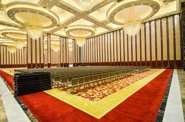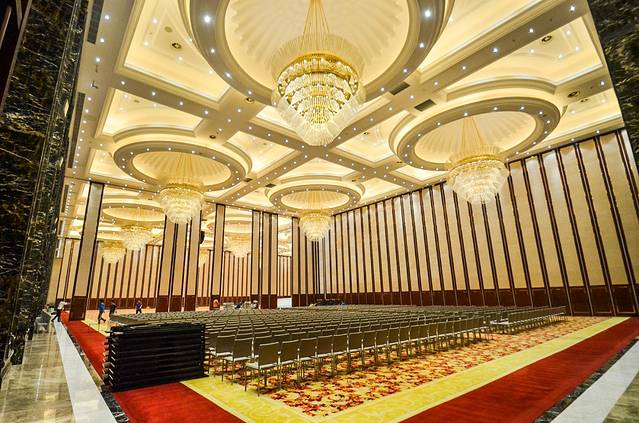 站在会议厅的正中间的位置看这个会议厅是不是很大,很奢华呢?对了,这只是部分会议厅合并的,如果把所有的小型会议单厅打开连在一起堪称是庞大气势的艺术品了。