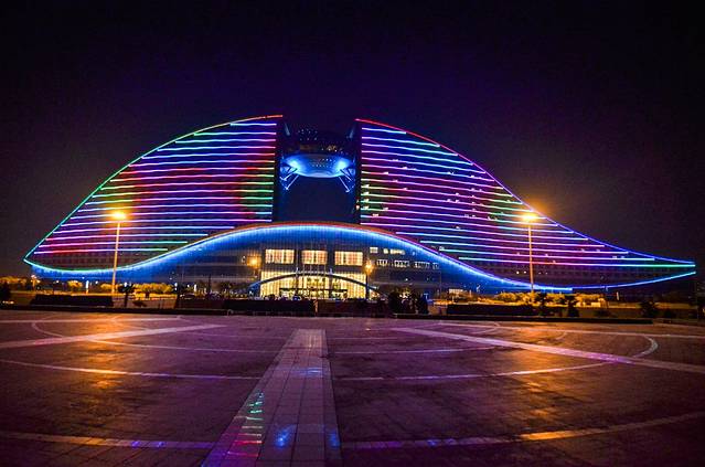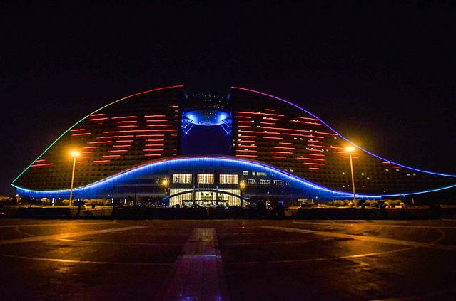 走到酒店的近处,会觉得更加的美。因此外面的冷色的灯光与内部温暖的光如此在这个中心点上进行撞击分割,本身就是一种非常对比度很高的冲击美!